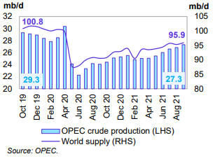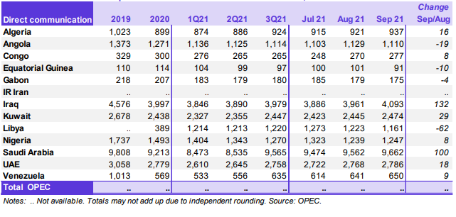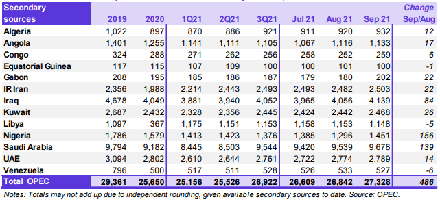Согласно вторичным источникам, общая добыча нефти ОПЕК-13 в сентябре 2021 года составила в среднем 27,33 млн баррелей в день, что на 0,49 млн баррелей в день больше, чем в аналогичные показатели за предыдущий месяц. Добыча нефти увеличилась в основном в Нигерии, Саудовской Аравии и Ираке.