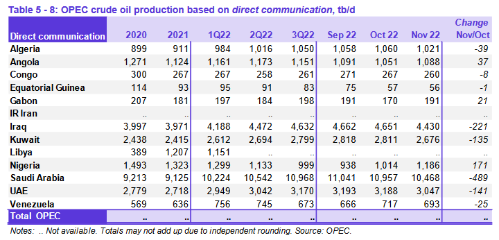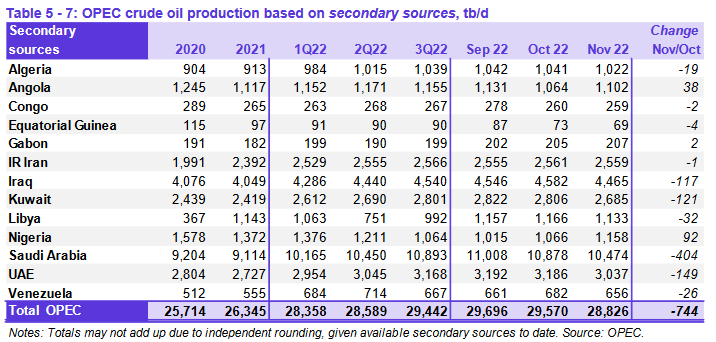 Согласно вторичным источникам, общая добыча сырой нефти ОПЕК-13 в среднем составляла 28,83 млн б/д в ноябре 2022 года, что на 744 трлн б/д ниже, чем в месячном исчислении. Добыча сырой нефти увеличилась в основном в Нигерии и Анголе и снизилась в Саудовской Аравии, ОАЭ, Кувейте и Ираке.