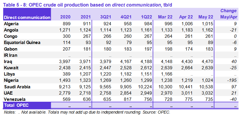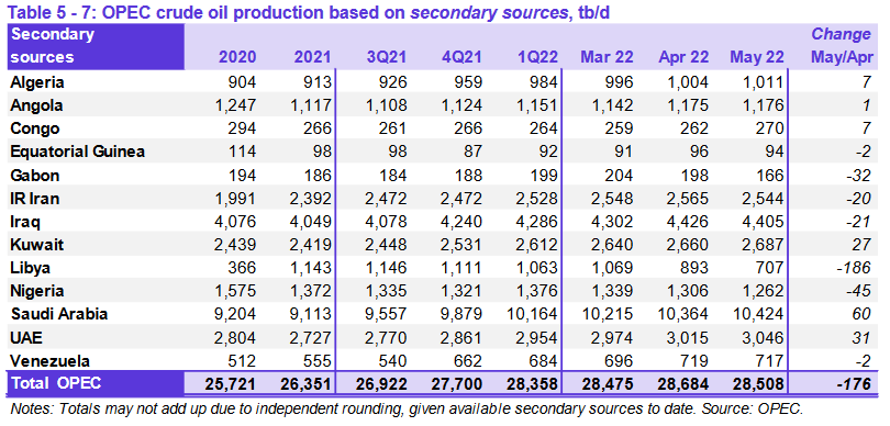 Согласно вторичным источникам, общий объем добычи сырой нефти ОПЕК-13 в мае 2022 года составлял в среднем 28,51 млн баррелей в день. Добыча увеличилась в основном в Саудовской Аравии, ОАЭ и Кувейте, снизилась в Ливии, Нигерии, Ираке, Габоне и Иране.