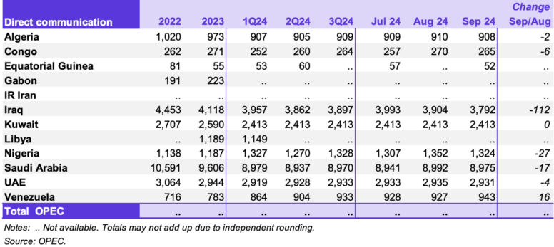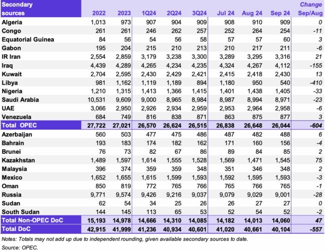 По данным вторичных источников, общая добыча сырой нефти ОПЕК-12 в среднем составила 26,04 млн баррелей в сутки в сентябре 2024 года, что на 604 тыс. баррелей в сутки ниже предыдущего месяца. Добыча сырой нефти увеличилась в основном в Иране и Кувейте, тогда как добыча в Ливии, Ираке, Нигерии и Саудовской Аравии снизилась.
