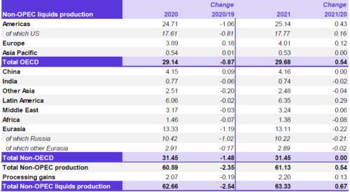 Прогноз по росту объемов производства жидких видов топлива в странах, не входящих в ОПЕК, в 2021 году был пересмотрен в сторону снижения. В настоящий момент прогнозируется увеличение показателя на 0.67 млн. баррелей в день до 63.33 млн. баррелей в день.