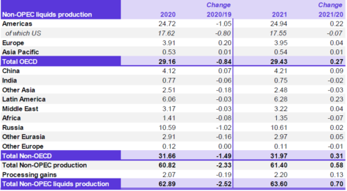 В 2020 году объемы производства жидких видов топлива в странах, не входящих в ОПЕК, сократились на 2.52 млн. баррелей в день: в России, США, Канаде, Колумбии, Казахстане, Великобритании, Малайзии, Азербайджане, Индии и Эквадоре.