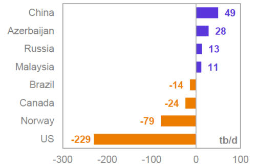 В наибольшей степени в сторону снижения был пересмотрен прогноз по производительности в США (229 тыс. баррелей в день), в Норвегии (79 тыс. баррелей в день), Канаде (24 тыс. баррелей в день), Бразилии (14 тыс. баррелей в день).