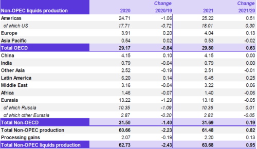 Прогноз по объемам производства жидких видов топлива в странах, не входящих в ОПЕК, в 2021 году был пересмотрен в сторону увеличения на 0.06 млн. баррелей в день. Ожидается, что данный показатель возрастет на 0.95 млн. баррелей в день.