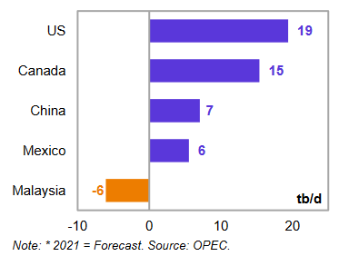 Прогноз предложения нефти на 2021 год в первую очередь предполагает рост в Канаде, России, Китае, Норвегии, Бразилии, Гайане и Катаре. Прогнозируется снижение добычи в Великобритании, Колумбии, Индонезии и Египте. Темпы роста предложения в странах, не входящих в ОПЕК, в 2022 году также останутся неизменными на уровне 3,0 млн б/д по сравнению с прошлым годом и составят в среднем 66,7 млн ​​б/д.