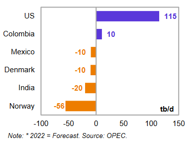 Повышение прогноза предложения в США компенсируется корректировкой в ​​сторону понижения прогноза для Норвегии на 0,06 млн б/д. Предложения по Индии и Мексике также были пересмотрены в сторону понижения на 0,02 млн б/д и 0,01 млн б/д в 2022 году соответственно.