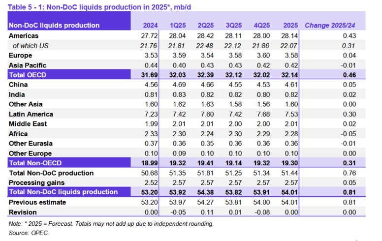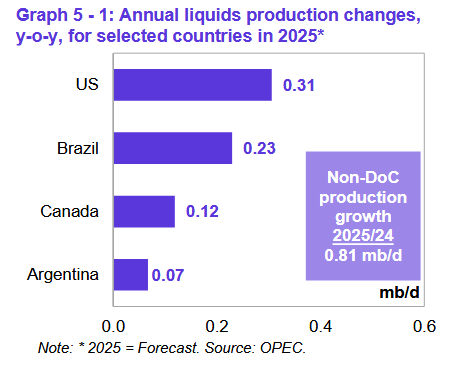 В 2025 году ожидается рост производства жидких углеводородов, не входящих в DoC, на уровне около 0,8 млн баррелей в сутки. Рост остается неизменным по сравнению с оценкой прошлого месяца. Ожидается, что ежегодный рост будет обеспечиваться в основном за счет США, Бразилии, Канады и Аргентины.