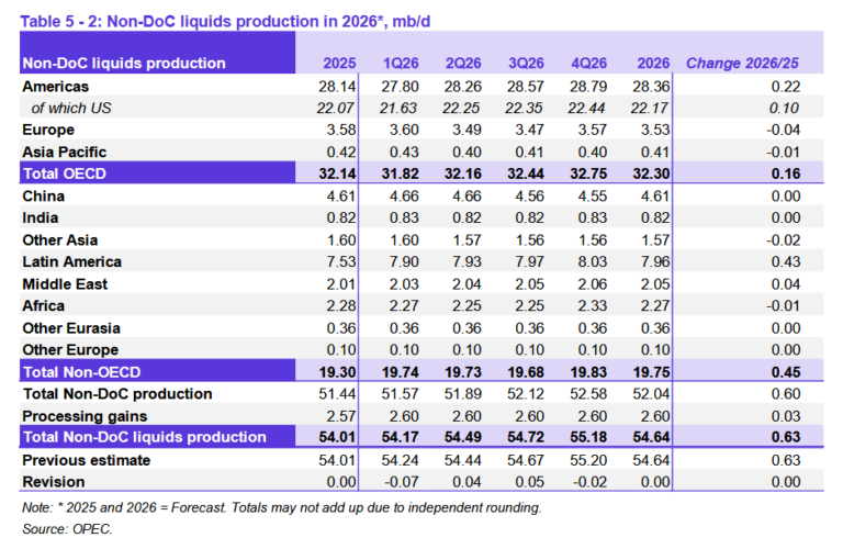 Ожидается, что добыча ШФЛУ и нетрадиционных жидких углеводородов ОПЕК вырастет на 130 тб/сут в 2025 году в среднем до 5,9 млн баррелей в сутки, а затем увеличится на 150 тб/сут в 2026 году в среднем до 6,0 млн баррелей в сутки.