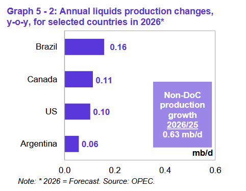 Прогнозируется, что в 2026 году производство жидких углеводородов, не входящих в DoC, вырастет на 0,6 млн баррелей в сутки, что не изменится по сравнению с оценкой прошлого месяца. Ожидается, что основными факторами роста вновь станут Бразилия, Канада, США и Аргентина.