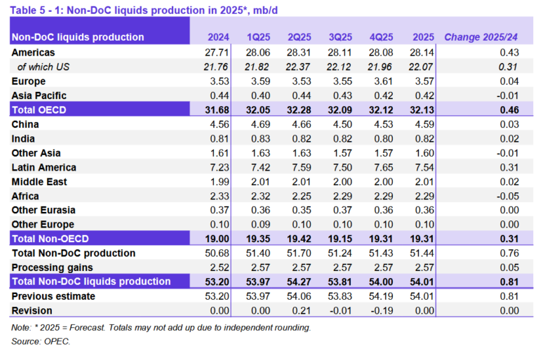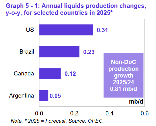 Ожидается, что производство жидких углеводородов из стран, не входящих в DoC, вырастет примерно на 0,8 млн баррелей в сутки в 2025 году в среднем до 54,0 млн баррелей в сутки, что не изменится по сравнению с оценкой прошлого месяца. Ожидается, что основной рост будет обеспечен в США, Бразилии, Канаде и Аргентине, а основной спад ожидается в Анголе.