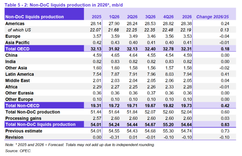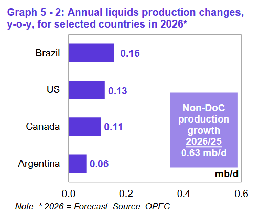Прогнозируется, что в 2026 году производство жидких углеводородов, не входящих в DoC, вырастет на 0,6 млн баррелей в сутки, что на 0,1 млн баррелей в сутки ниже оценки прошлого месяца. Ожидается, что основными факторами роста также станут Бразилия, США, Канада и Аргентина.