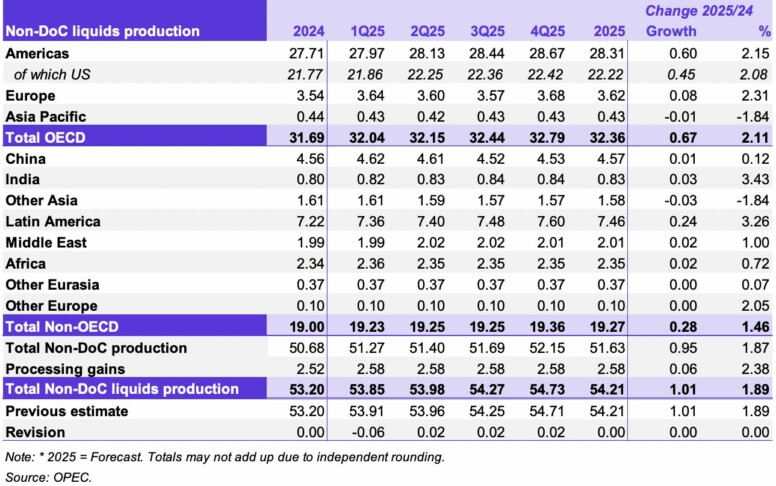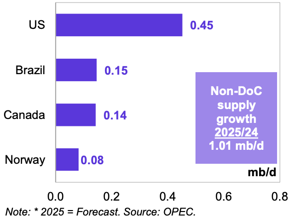 Ожидается, что в 2025 году объем поставок жидких углеводородов из стран, не участвующих в DoC, увеличится на 1,0 млн баррелей в сутки и составит в среднем 54,2 млн баррелей в сутки. Рост будет обеспечен за счет США, Бразилии, Канады и Норвегии, а основное снижение ожидается в Анголе.