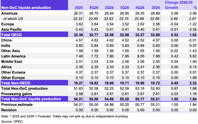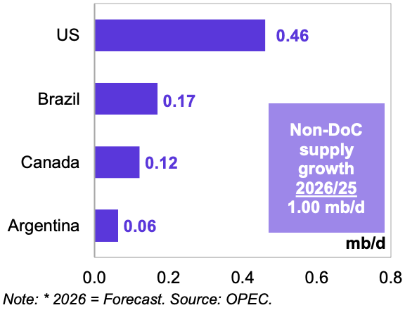 Прогнозируется, что в 2026 году предложение жидких углеводородов в странах, не входящих в Соглашение о разделе продукции, вырастет на 1,0 млн баррелей в сутки. Основными драйверами этого роста, как ожидается, станут США, Бразилия, Канада и Аргентина.