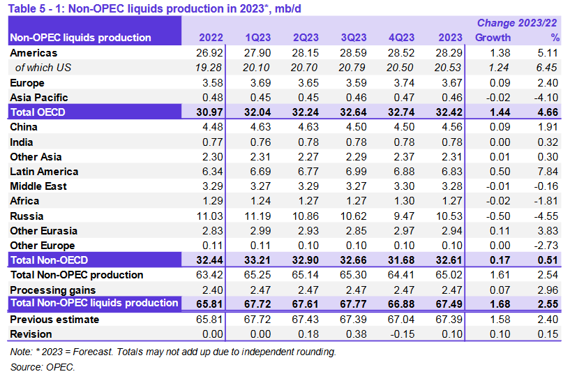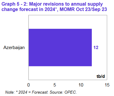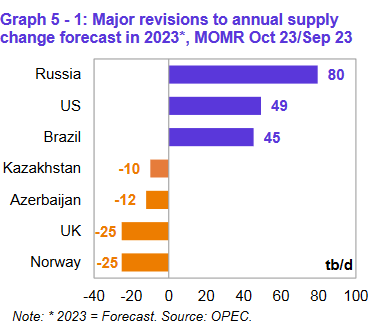 Основными драйверами роста являются США, Канада, Гайана, Бразилия, Норвегия и Казахстан. В то же время прогнозируется, что наибольший спад производства произойдет в Мексике и Малайзии. Прогнозируется, что добыча ШФЛУ и нетрадиционных жидких углеводородов ОПЕК в 2023 году вырастет примерно на 50 тб/д до среднего уровня 5,4 млн б/д и увеличится на 65 тб/д до в среднем 5,5 млн б/д в 2024 г. Добыча сырой нефти ОПЕК-13 согласно доступным вторичным источникам, в сентябре увеличилась на 273 тб/д м/м до в среднем 27,75 млн б/д. Производство жидких углеводородов за пределами ОПЕК в сентябре, включая ШФЛУ ОПЕК, по оценкам, сократилось на 0,3 млн б/д по сравнению с предыдущим месяцем и составило в среднем 72,9 млн б/д. Это увеличение на 1,4 млн б/д по сравнению с аналогичным периодом прошлого года. В результате предварительные данные показали, что мировые поставки нефти в сентябре практически не изменились по сравнению с предыдущим месяцем и составили в среднем 100,6 млн б/д, что на 0,5 млн б/д меньше по сравнению с аналогичным периодом прошлого года.