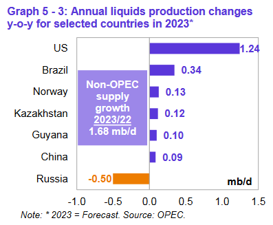 Ключевыми драйверами роста поставок жидкого топлива за пределами ОПЕК в 2023 году, по прогнозам, станут США, Бразилия, Норвегия, Казахстан, Гайана и Китай, тогда как наибольший спад добычи нефти ожидается в России.