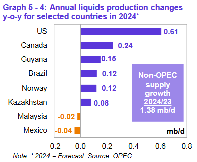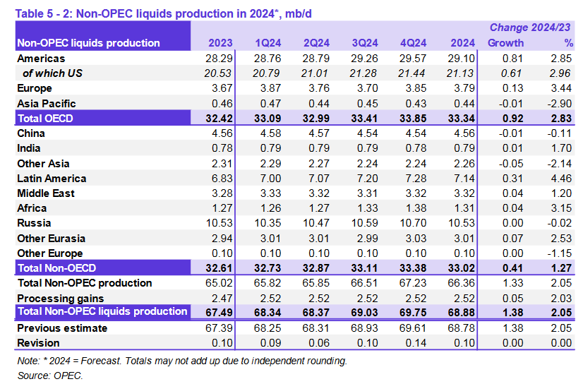 Прогнозируется, что добыча жидких углеводородов в странах, не входящих в ОПЕК, в 2024 году вырастет на 1,4 млн б/д и составит в среднем 68,9 млн б/д (включая прирост от переработки на 50 тыс. б/д). Прогнозируется, что предложение жидких углеводородов в странах ОЭСР увеличится на 0,9 млн б/д и составит в среднем 33,3 млн б/д, в то время как предложение жидких углеводородов из стран, не входящих в ОЭСР, вырастет на 0,4 млн б/д и составит в среднем 33,0 млн б/д.