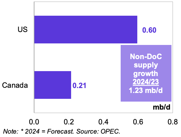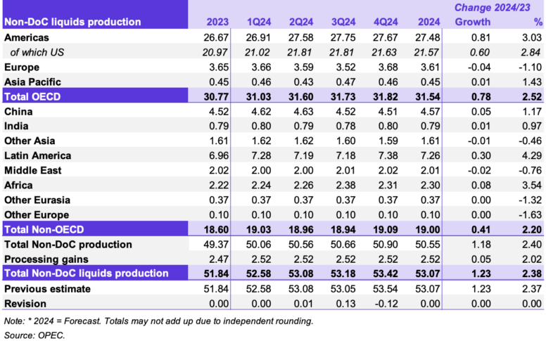 Ожидается, что поставки жидких углеводородов из стран, не участвующих в DoC, вырастут на 1,2 млн баррелей в сутки в 2024 году и составят в среднем 53,1 млн баррелей в сутки.