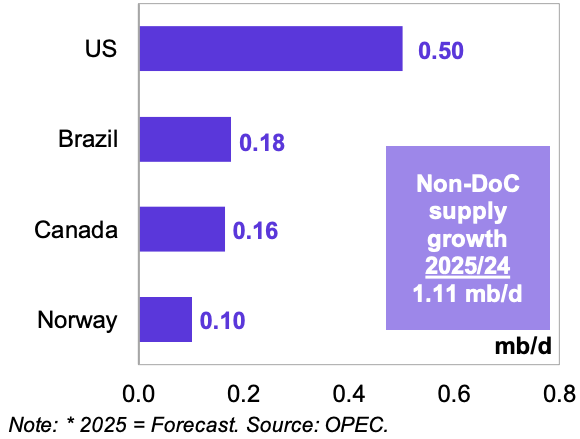 В 2025 году ожидается рост предложения жидких углеводородов за пределами РС на 1,1 млн баррелей в сутки, что в среднем составит 54,2 млн баррелей в сутки. Рост будет обеспечиваться в основном за счет США, Бразилии, Канады и Норвегии, а основное снижение ожидается в Анголе.