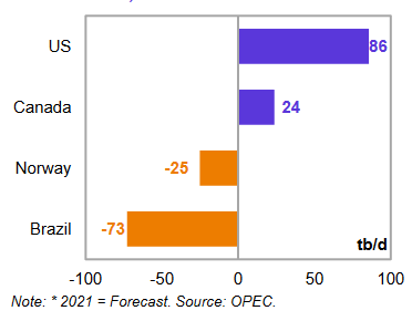 Рост предложения жидких углеводородов в странах, не входящих в ОПЕК, в 2021 году (включая прирост от переработки 0,13 млн баррелей в сутки) останется неизменным на уровне около 0,7 млн баррелей в день (б/д) по сравнению с прошлым годом, в среднем до 63,7 млн б/д. Некоторые пересмотры в сторону повышения для США и Канады были компенсированы понижением прогнозов предложения в других странах, таких как Бразилия и Норвегия, из-за неожиданного снижения объемов производства в четвертом квартале текущего года.