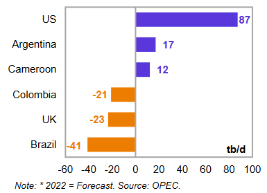 Кроме того, были пересмотрены прогнозы предложения жидких углеводородов из Аргентины и Камеруна. С учетом этих изменений, прогноз предложения жидких углеводородов в странах, не входящих в ОПЕК, на 2022 год был повышен на 13 тб/д до в среднем 66,67 мб/д.