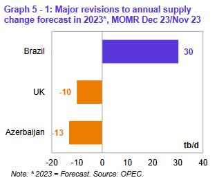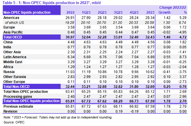 Ожидается, что добыча нефти в странах, не входящих в ОПЕК, в 2023 году вырастет на 1,8 млн баррелей в день (б/д) по сравнению с аналогичным периодом прошлого года, достигнув 67,6 млн б/д. Пересмотр прогнозов для Латинской Америки в сторону повышения компенсировал пересмотр в сторону понижения для других регионов Азии, Великобритании и остальных регионов Евразии.