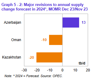 Прогноз роста добычи нефти в странах, не входящих в ОПЕК, в 2024 году остается в целом неизменным по сравнению с оценкой предыдущего месяца в 1,4 млн баррелей в сутки. Пересмотры в сторону понижения прогнозов предложения Казахстана и Омана в основном компенсировались пересмотром в сторону повышения прогнозов по некоторым другим странам.