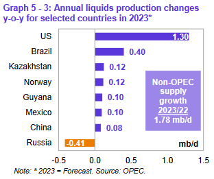 По прогнозам, ключевыми драйверами роста предложения жидкого топлива, не входящих в ОПЕК, в 2023 году станут США, Бразилия, Казахстан, Норвегия, Гайана, Мексика и Китай, тогда как наибольший спад добычи нефти прогнозируется в России.