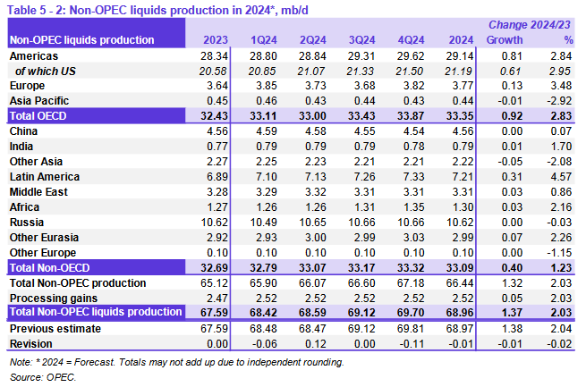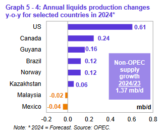По прогнозам, в 2024 году ключевыми драйверами роста предложения нефти, не входящих в ОПЕК, станут США, Канада, Гайана, Бразилия, Норвегия и Казахстан, в то время как прогнозируется, что наибольшее снижение добычи нефти произойдет в Мексике и Малайзии.