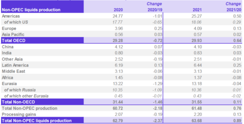 Ожидается, что в 2021 году производительность в странах, не входящих в ОПЕК, возрастет на 0.9 млн. баррелей в день до 63.68 млн. баррелей в день.
