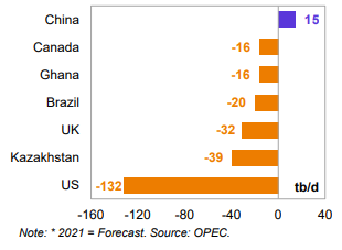 Рост добычи жидких углеводородов в странах, не входящих в ОПЕК, в 2021 году был пересмотрен в сторону понижения на 256 тысяч баррелей в день по сравнению с предыдущими оценками, в том числе на 172 тысячи баррелей в день в ОЭСР и на 85 тысяч баррелей в день в регионах, не входящих в ОЭСР, в основном за счет общего пересмотра в сторону понижения на 604 тысячи баррелей в день в третьем квартале 2021, а также на 317 тысяч баррелей в день в четвертом квартале 2021. С учётом данного пересмотра, прогнозируется увеличение предложения по жидким видам топлива на 0,66 млн баррелей в день в 2021 году до среднего показателя 63,64 млн баррелей в день. Основной пересмотр в сторону понижения произошел в ОЭСР Северной и Южной Америки на 148 тысяч баррелей в день (266 тысяч баррелей в день в третьем квартале 2021 и 303 тысячи баррелей в день в четвертом квартале 2021), из-за перебоев в добыче нефти в Мексиканском заливе, урагана Иды, и непредвиденной ситуации в Канаде на нефтеносных песках Suncor. Рост предложения в США и Канаде в 2021 году был пересмотрен в сторону понижения на 0,13 млн баррелей в день и 0,02 млн баррелей в день, соответственно.
