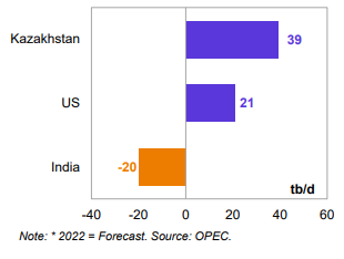 Прогноз роста предложения в странах, не входящих в ОПЕК, на 2022 год был повышен на незначительные 0,07 млн баррелей в день и теперь составляет 3,0 млн баррелей в день. Изменения коснулись США и Казахстана, а также несколько незначительных пересмотров в сторону увеличения в других странах из-за изменения базовых показателей. Рост предложения в США был пересмотрен в сторону увеличения на 0,02 млн баррелей в день до 0,83 млн баррелей в день. В Казахстане прогноз предложения также был пересмотрен в сторону повышения на 0,04 млн баррелей в день. Прогноз предложения нефти в Индии был пересмотрен в сторону понижения на 0,02 млн баррелей в день и теперь прогнозируется рост на 0,03 млн баррелей в день в 2022 году.
