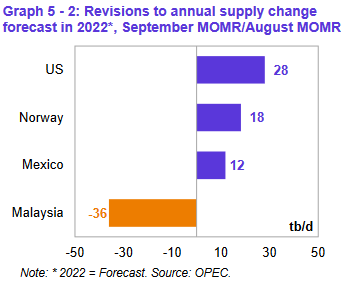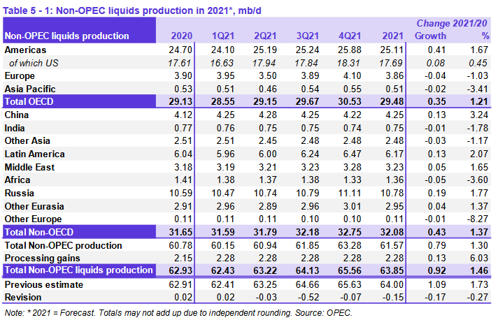 Рост добычи жидких углеводородов в странах, не входящих в ОПЕК, в 2021 году был пересмотрен в сторону понижения на 170 тб/д по сравнению с предыдущей оценкой из-за пересмотра вниз на 0,52 мб/д в третьем квартале 2021 года. Изменения в основном связаны с перебоями в добыче нефти в странах ОЭСР на 0,46 мб/д в третьем квартале 2021 года после урагана Ида в Мексиканском заливе, взрыва и пожара на морской платформе в Мексике, а также с добычей нефти ниже расчетной в Северном море.
