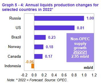 Прогноз роста предложения в странах, не входящих в ОПЕК, на 2022 год не изменился на уровне 2,9 мб/д с учетом корректировок до 66,8 мб/д (включая восстановление прибылей от переработки на 0,11 мб/д). С учетом ожидаемого роста газоконденсатов ОПЕК, ожидается рост предложения жидких углеводородов на 3,1 мб/д. Основными драйверами роста предложения являются Россия (1,0 мб/д) и США (0,78 мб/д), за которыми следуют Бразилия, Норвегия, Канада, Казахстан, Гайана и другие страны, не входящие в ОПЕК.