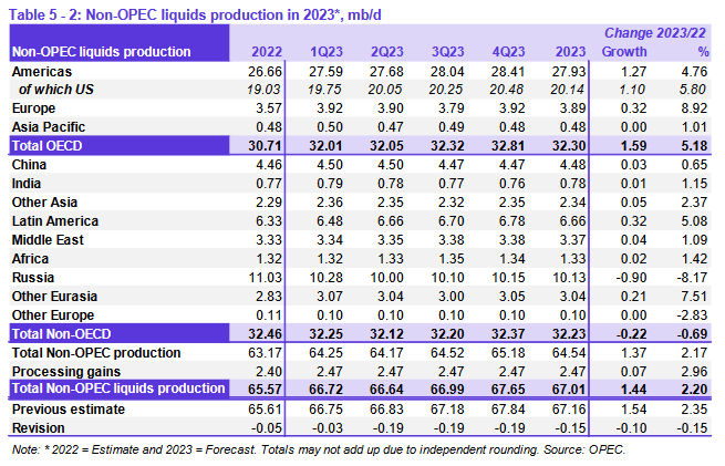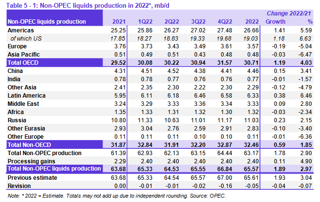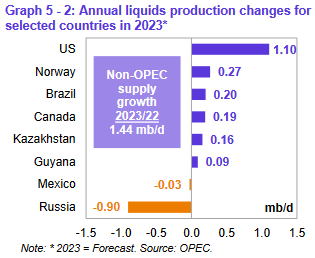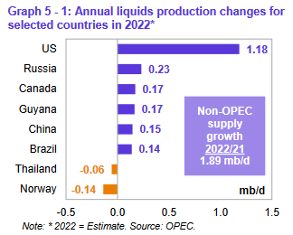 По оценкам, ключевыми драйверами роста поставок жидких углеводородов, не входящих в ОПЕК, в 2022 году будут США, Россия, Канада, Гайана, Китай и Бразилия. Наибольшее снижение добычи нефти произойдет в Норвегии и Таиланде. Прогнозируется, что в 2023 году ключевыми драйверами роста предложения нефти за пределами ОПЕК будут США, Норвегия, Бразилия, Канада, Казахстан и Гайана. Наибольшее снижение добычи нефти ожидается в России и Мексике.