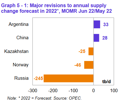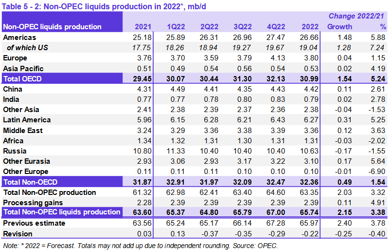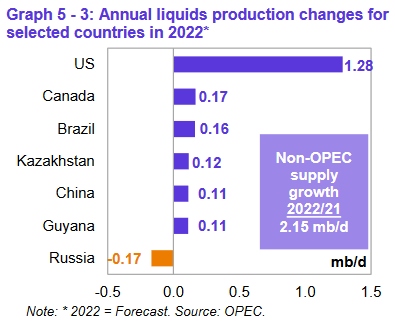Прогнозируется, что в 2022 году ключевыми драйверами роста предложения, не входящего в ОПЕК, будут США, Канада, Бразилия, Казахстан, Китай и Гайана, в то время как прогнозируется снижение добычи нефти в основном в России, Индонезии и Таиланде.