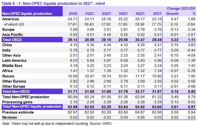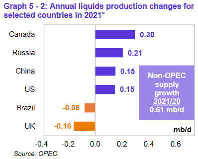 По оценкам, ключевыми драйверами роста поставок жидких углеводородов, не входящих в ОПЕК, в 2021 году были Канада, Россия, Китай и США. Производство снизилось в Великобритании и Бразилии.