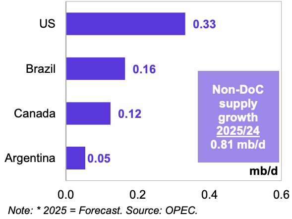 Ожидается, что в 2025 году объем поставок жидких углеводородов из стран, не участвующих в DoC, увеличится примерно на 0,8 млн баррелей в сутки и составит в среднем 54,0 млн баррелей в сутки. Рост будет обеспечиваться за счет США, Бразилии, Канады и Аргентины, а основное снижение ожидается в Анголе.