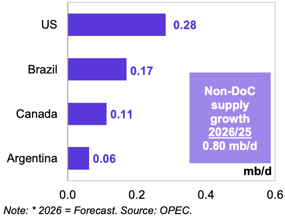 Прогнозируется, что в 2026 году предложение жидких углеводородов, не относящихся к DoC, вырастет на 0,8 млн баррелей в сутки. Этот показатель пересмотрен в сторону понижения на 96 тб/д по сравнению с оценкой прошлого месяца. Ожидается, что основными драйверами роста будут США, Бразилия, Канада и Аргентина.