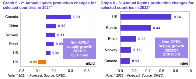 В 2021 году, по прогнозам, ключевыми драйверами роста поставок жидких углеводородов в страны, не входящие в ОПЕК, станут Канада, Китай, Норвегия, Бразилия, США, Гайана, Россия и Азербайджан. В то же время добыча нефти, как ожидается, сократится в основном в Великобритании, Колумбии, Египте и в Южном и Северном Суданах.