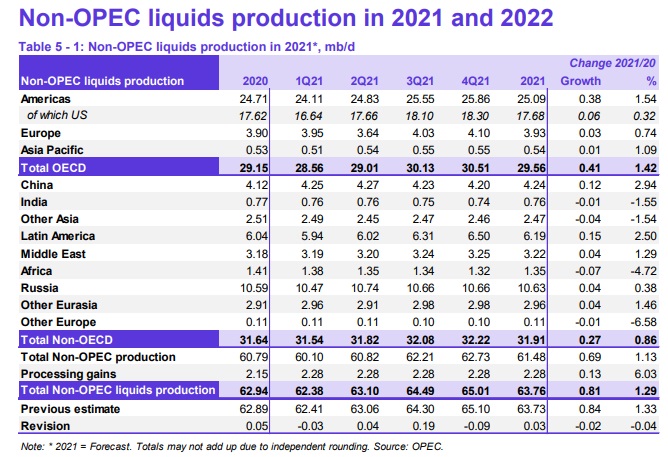 Темпы роста добычи жидких углеводородов в странах, не входящих в ОПЕК, в 2021 году были пересмотрены в сторону понижения на 26 тб/д в сравнении с предыдущим месяцем, и теперь прогнозируется рост на 0,81 мб/д (включая прибыль от переработки), в среднем до 63,76 мб/д.Это произошло в основном из-за пересмотра прогнозов вниз в Индонезии, Великобритании, Азербайджане, Бразилии и Норвегии.Между тем, прогнозы производства в США и Канаде были пересмотрены вверх по сравнению с предыдущей оценкой в связи с более высоким, чем ожидалось, объемом производства во 2К21.