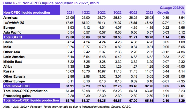 По прогнозам, в 2022 году ключевыми драйверами роста предложения в странах, не входящих в ОПЕК, станут США, Россия, Бразилия, Норвегия, Канада, Гайана, Казахстан, Китай, Индия, Оман, Катар, Великобритания и Азербайджан. Добыча нефти снизится в основном в Египте, Таиланде, Индонезии и Малайзии. Многие институты и агентства прогнозируют значительный рост производства в следующем году, но не в США и России. Их краткосрочные прогнозы в основном основаны на различных суждениях относительно сохранения финансовых и материально-технических условий в США в 2022 году и неопределенности в отношении производства в других странах.