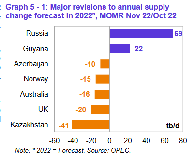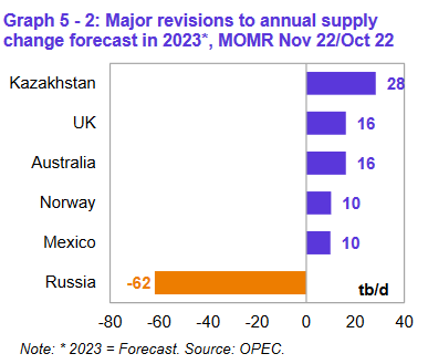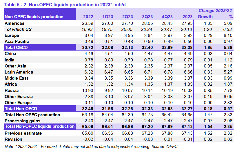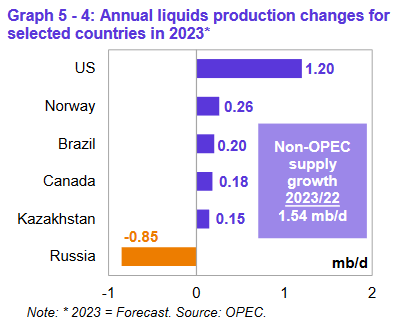 На 2023 год ключевыми драйверами роста поставок, не входящих в ОПЕК, по прогнозам, будут США, Норвегия, Бразилия, Канада, Казахстан и Гайана, а добыча нефти, по прогнозам, сократится, в основном в России и Мексике.