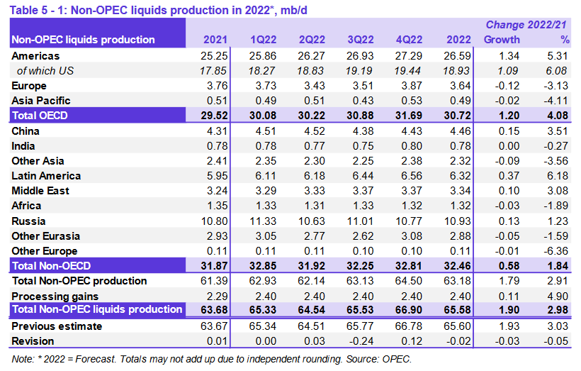 Прогноз поставок жидких углеводородов, не входящих в ОПЕК, на 2022 год был несколько снижен на 24 трлн б/д до среднего уровня 65,6 млн б/д. Среднегодовой рост составил 1,9 млн б/д., что на 30 тыс. б/д меньше, чем в предыдущем месяце. Прогноз роста предложения ОЭСР на 2022 год был пересмотрен в сторону понижения на 39 тб/сут. ОЭСР в Европе и ОЭСР в Азиатско-Тихоокеанском регионе были пересмотрены в сторону понижения, в то время как ОЭСР в Америке были пересмотрены в сторону повышения по сравнению с предыдущим месяцем.