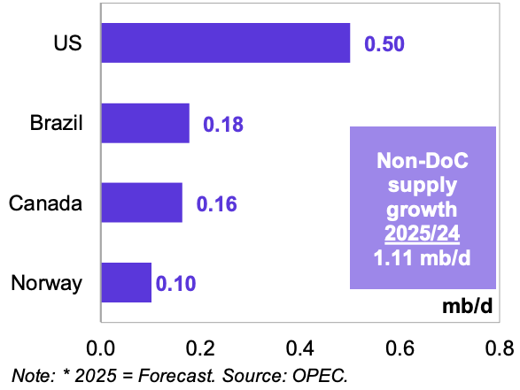 В 2025 году ожидается рост предложения жидких углеводородов за пределами РС на 1,1 млн баррелей в сутки до среднего уровня 54,3 млн баррелей в сутки. Рост будет обеспечен за счет США, Бразилии, Канады и Норвегии, в то время как основное снижение ожидается в Анголе.