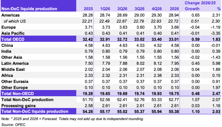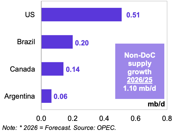 Прогнозируется, что в 2026 году предложение жидких углеводородов в странах, не входящих в состав РС, вырастет на 1,1 млн баррелей в сутки. Основными драйверами ожидаемого роста являются США, Бразилия, Канада и Аргентина.