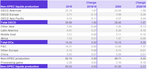Показатель темпов роста объемов производства жидких видов топлива в странах, не входящих в ОПЕК, в 2020 году был пересмотрен в сторону увеличения на 0.3 млн. баррелей в день по сравнению с предшествующим отчетом. В настоящий момент ожидается, что в 2020 году данный показатель сократится на 3.2 млн. баррелей в день до 61.80 млн. баррелей в день.