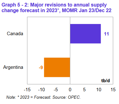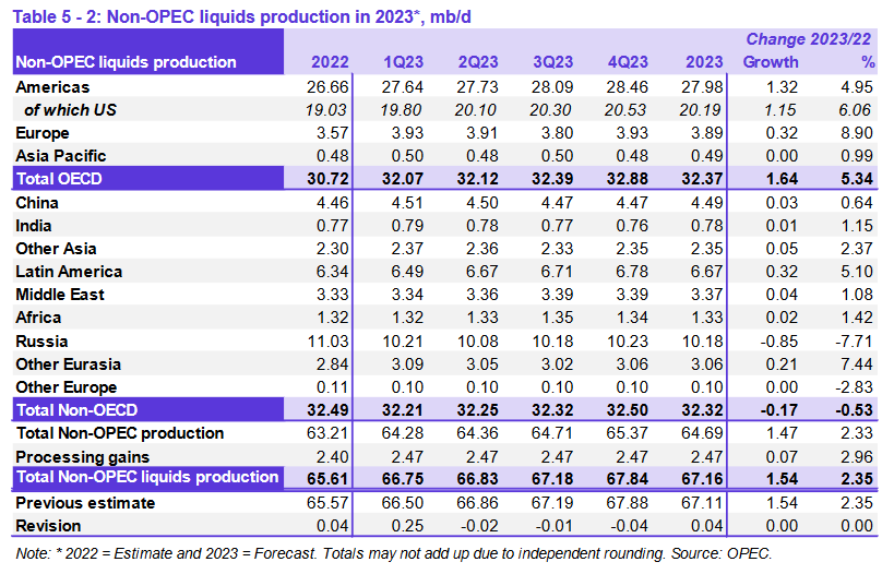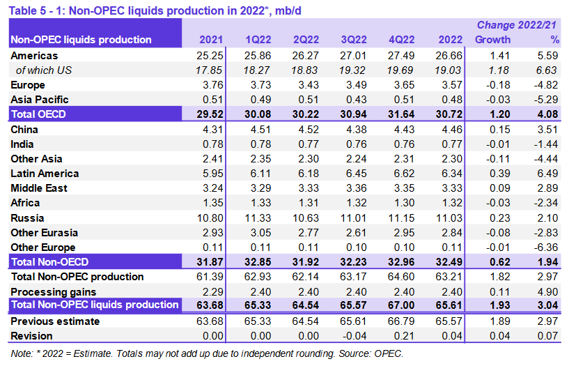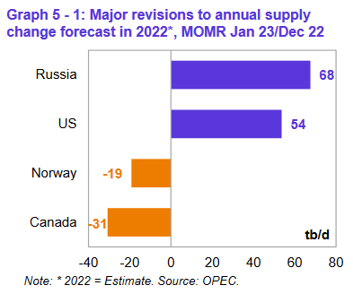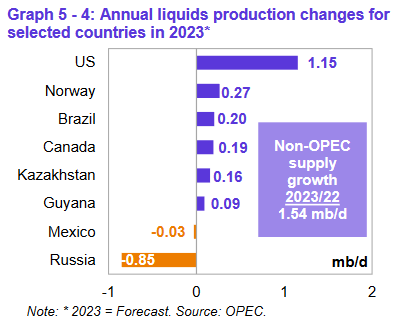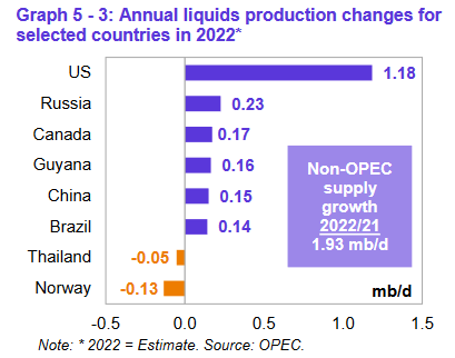 Ключевыми драйверами роста поставок жидких углеводородов, не входящих в ОПЕК, в 2022 году прогнозируются США, Россия, Канада, Гайана, Китай и Бразилия, в то время как ожидается, что наибольшее снижение добычи нефти произойдет в Норвегии и Таиланде. Прогнозируется, что в 2023 году ключевыми драйверами роста предложения за пределами ОПЕК будут США, Норвегия, Бразилия, Канада, Казахстан и Гайана, в то время как добыча нефти, по прогнозам, снизится в России и Мексике.