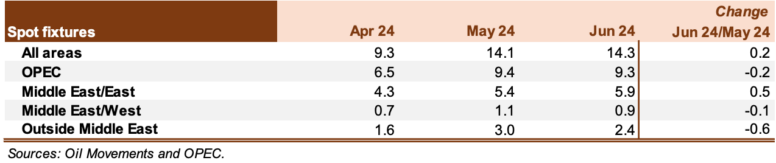 В июне количество спотовых матчей в мире увеличилось, поскольку увеличение количества матчей между Ближним Востоком и Западом опережало снижение в других регионах. Глобальные объемы продаж в среднем составили 14,3 млн баррелей в сутки, что представляет собой рост на 0,2 млн баррелей в сутки, или чуть более 1%, по сравнению с предыдущим месяцем. По сравнению с июнем 2023 года мировые спотовые продажи сократились на 0,9 млн баррелей в сутки, или примерно на 6%.