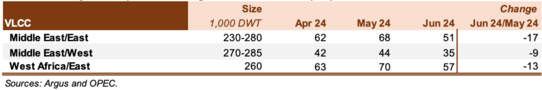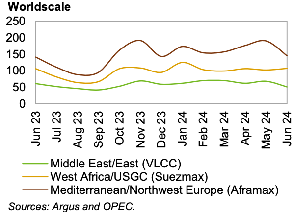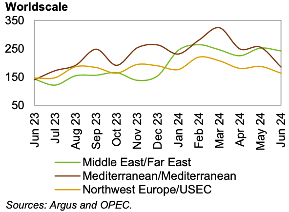 На маршруте Западная Африка – побережье Мексиканского залива США (USGC) спотовые ставки фрахта в июне составили в среднем WS107, что означает прирост на 5% за месяц. Спотовые ставки были всего на 1% выше по сравнению с тем же месяцем 2023 года.