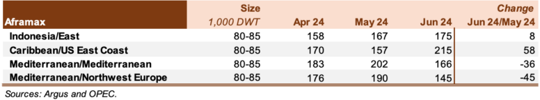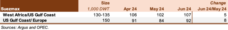 Спотовые фрахтовые ставки Suezmax показали лучшие результаты, чем у других классов танкеров на отслеживаемых маршрутах, увеличившись в среднем на 6% по сравнению с предыдущим месяцем в июне. Увеличение потоков в Северную Америку оказало поддержку. Они выросли на 5% по сравнению с тем же месяцем 2023 года.